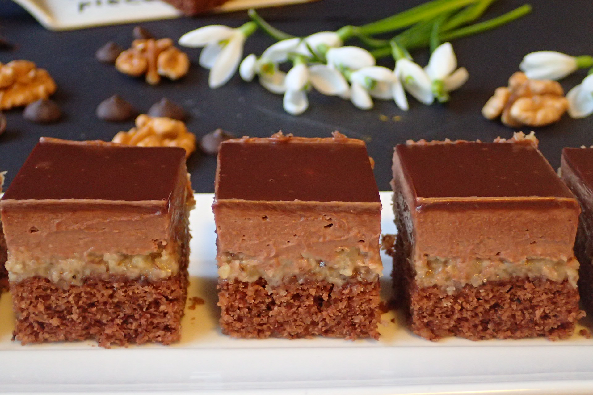Na kakaový krém uvaříme Zlaté Klasy v 800 ml mléka a s cukrem na hustý pudink. Necháme ho úplně vychladnout. Vychladnutý pudink postupně všleháváme do měkkého másla. Ořechovou náplň natřeme a uhladíme na upečeném korpusu a na ni navrstvíme kakaový krém a uhladíme povrch. Dáme do chladničky ztuhnout. Na ztuhnutý krém pak nalijeme polevu z čokolády a tuku, které spolu rozpustíme nad párou a necháme na koláči ztuhnout.