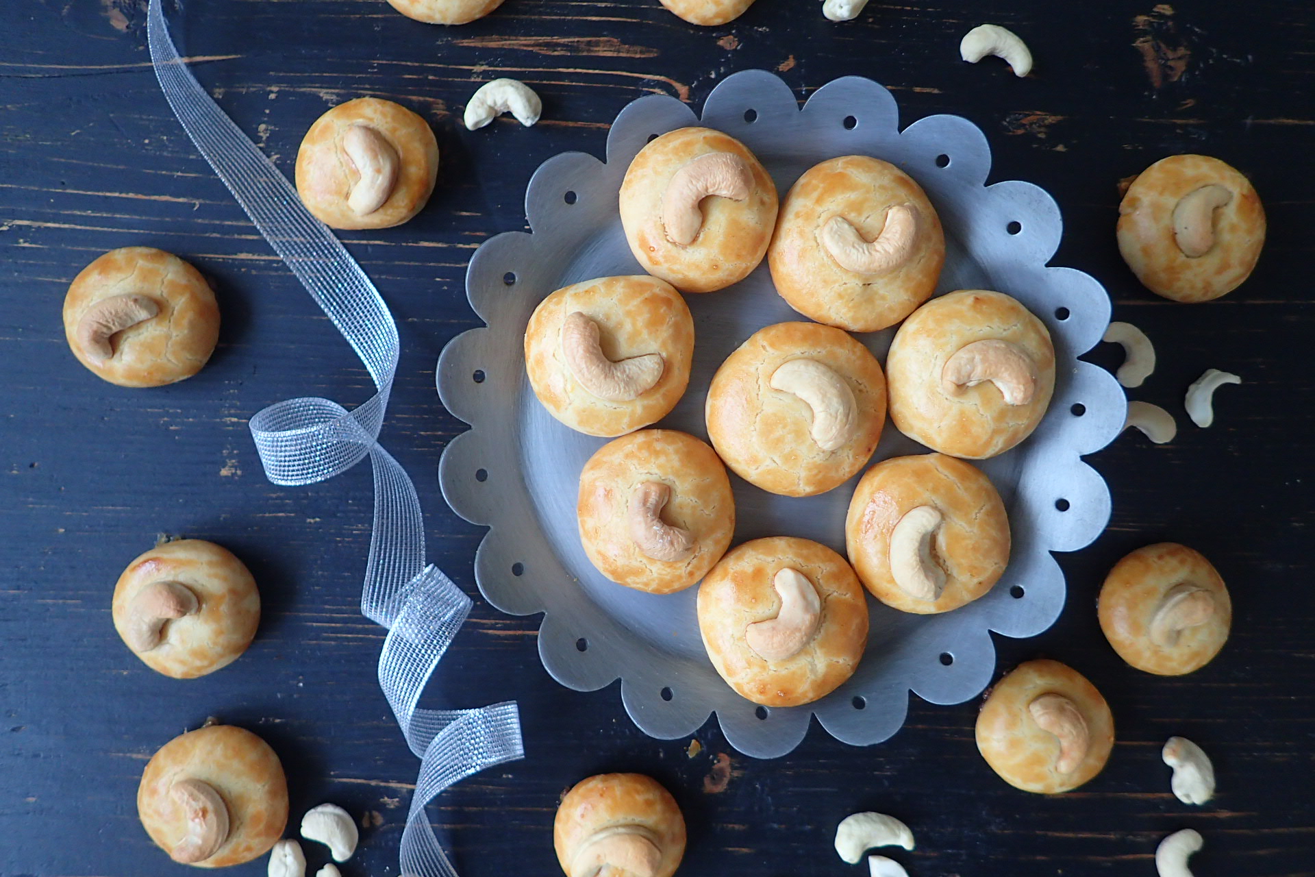 Z cesta nakrájame kúsky, ktoré vytvarujeme do guličiek. Poukladáme na plech, dlaňou ich mierne stlačíme. Pred pečením ich potrieme rozšľahaným vajíčkom a koláčiky ozdobíme orieškom.